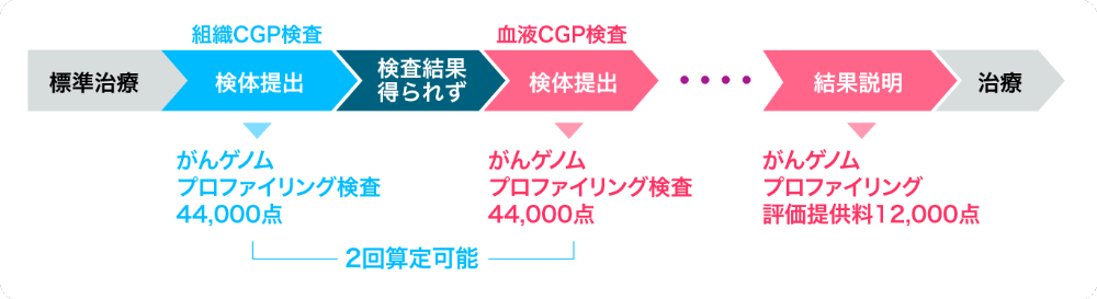 - CGP検査の出検時点で 44,000点が算定可能となるため、医療機関側で検査費用を立て替える負担を軽減することが可能となった。